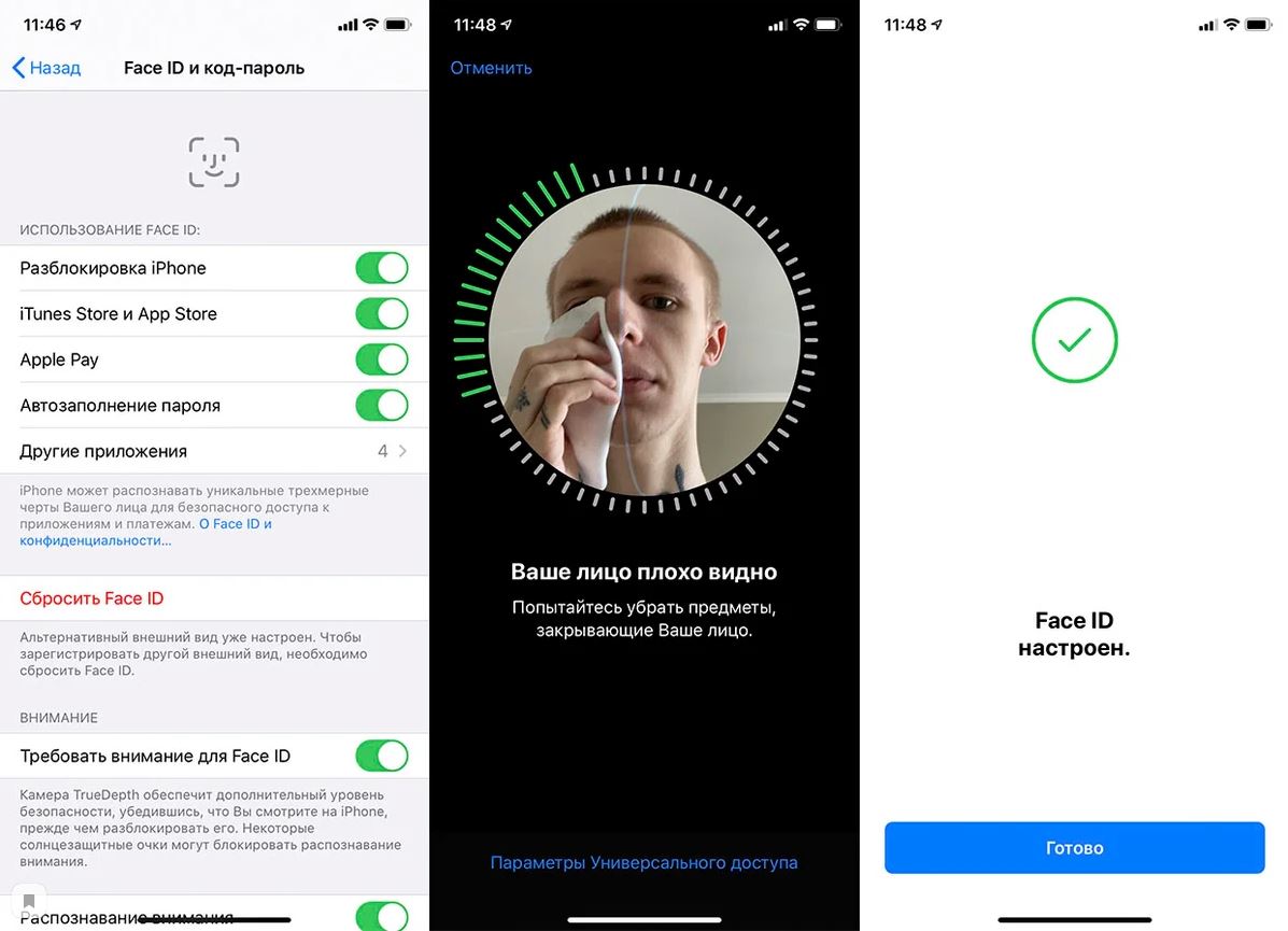 В настройках телефона необходимо сбросить уже имеющееся Face ID пользователя. После этого необходимо отсканировать лицо, уже надев медицинскую маску, но на пол лица. Пройдя данный этап, складываем маску пополам, и проводим те же манипуляции с другой половиной лица. Необходимо повторить операцию повторно, настроив «Альтернативный внешний вид».